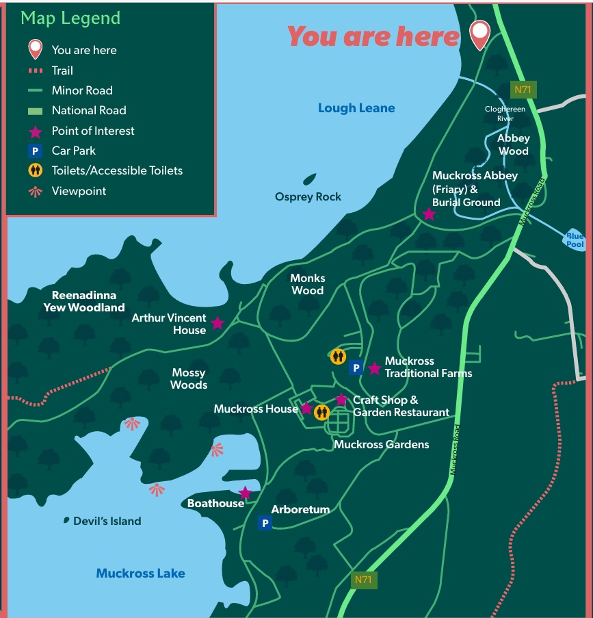 Currently Killarney National Park is approximately 10,800 ha. and incorporates lakes, woodlands, mountains, waterfalls, historic buildings and areas of significant natural heritage, including unique species & habitats. It is the first National Park in Ireland.